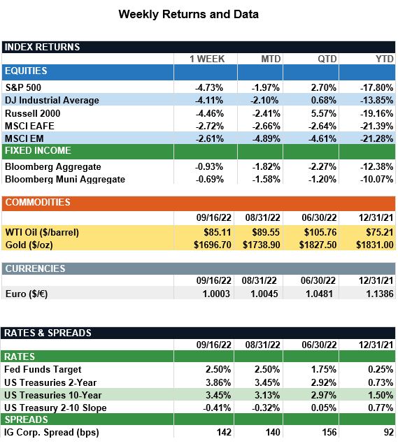 Overview: Global stocks traded lower last week amid ongoing angst that central banks around the world will continue with aggressive monetary policy in raising interest rates to fight inflation. In the U.S., the S&P 500 fell 4.7% following a higher-than-anticipated report on consumer prices (CPI). In the bond markets, yields increased sharply last week on the heels of the inflation report, as market expectations now are for the Federal Reserve to raise rates by at least 0.75% (75 basis points) at their policy meeting this Wednesday (Sept. 21). The U.S. 2-year Treasury yield finished the week at 3.86%, up from 3.45% at the beginning of September, as markets price in expectations of a 4.00% - 4.25% funds rate by year-end 2022. In economic news, the U.S. August consumer price index (CPI) rose 8.3% annualized and 0.1% month-over-month. The increase was larger than consensus expectations, as high food prices and rents continue to pressure inflation. Market focus this week will be on the Federal Reserve meeting concluding on Wednesday, as investors look for guidance on future policy.